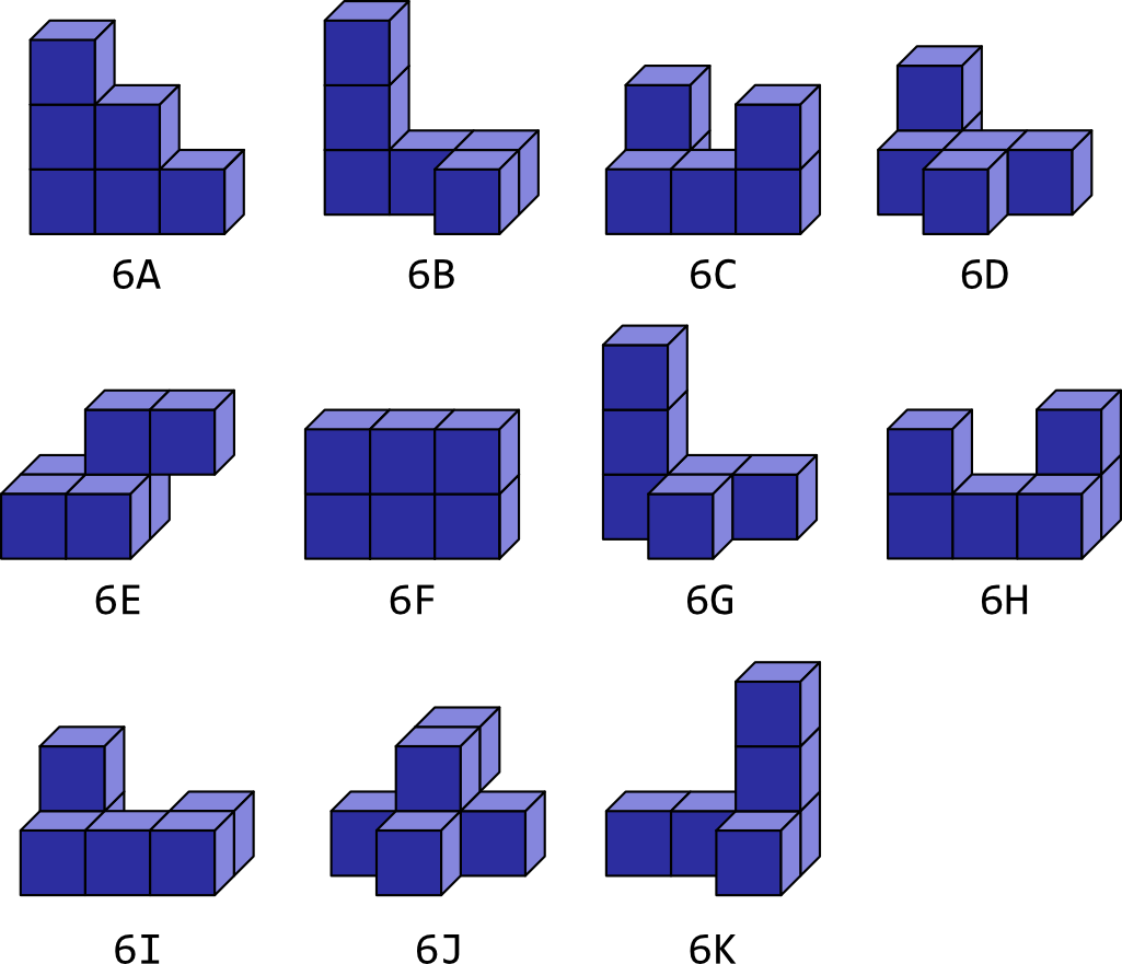 Un polycube constitué de 6 cubes est appelé un hexacube. Il en existe 166 différents dont 35 qui sont « plats ».