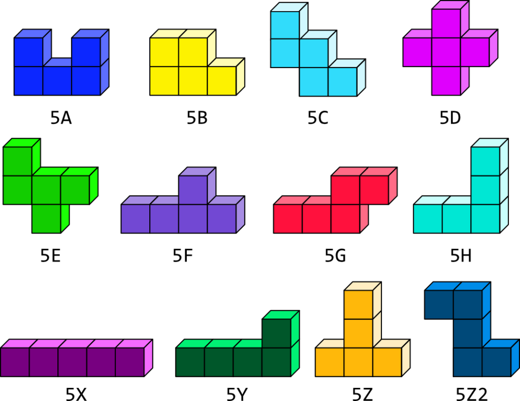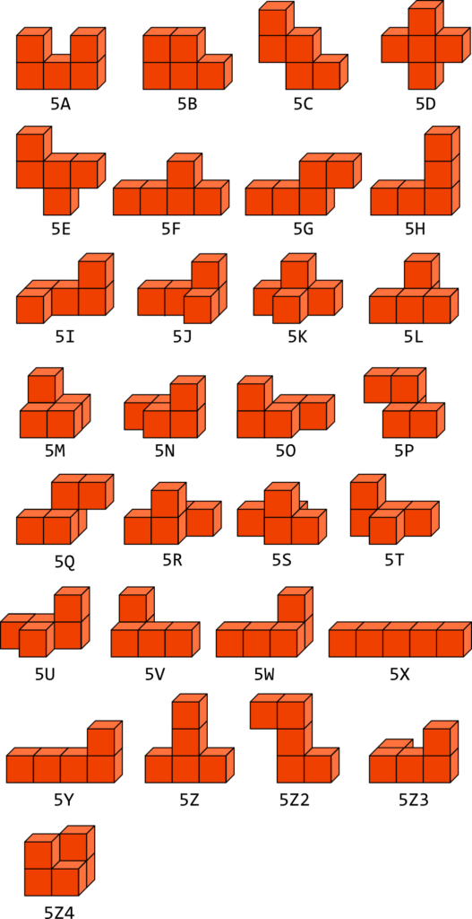 Les pentacubes « plats » sont appelés des pentaminos ou pentominos. Il y en a 12 (5A – 5B – 5C – 5D – 5E – 5F – 5G – 5H – 5X – 5Y – 5Z et 5Z2). Ils feront l’objet de plusieurs autres publications spécifiques car on les retrouve dans beaucoup de jeux ou de casse-têtes.