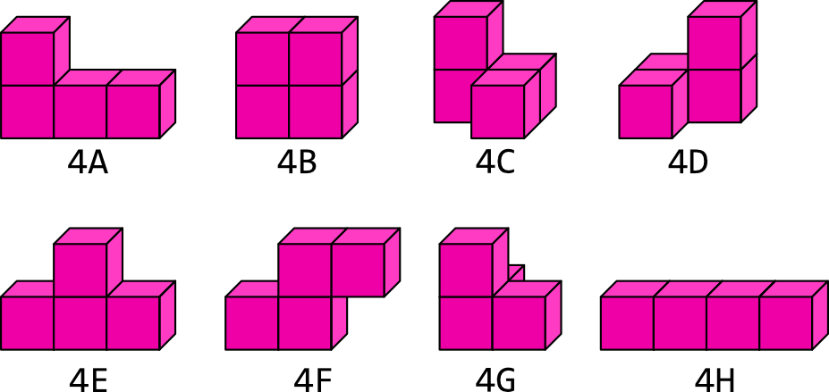 Un polycube constitué de 4 cubes est appelé un tétracube. Il en existe 8 différents dont 5 qui sont « plats » (4A – 4B – 4E – 4F et 4H).